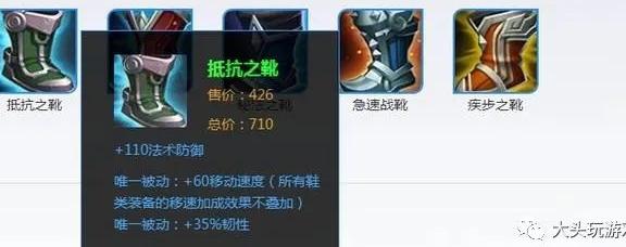 抵抗之靴提供35%韧性与110点法术防御,可减少35%被控制的持续时间,如减速、眩晕、击飞等效果。多数英雄优先选择此装备,即便前期未出,后期也可替换为该鞋以提升生存能力。