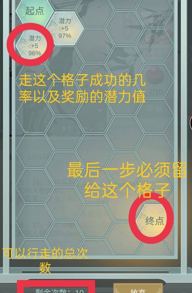 每个格子中的潜力在突破时并无作用,仅在成功后作为奖励赋予。由于潜力越多的格子行走成功率越低,移动时必须权衡取舍,合理选择路径以确保顺利前行。