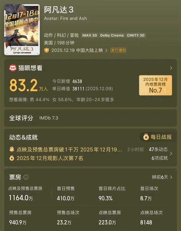截至13日中午,《阿凡达3》点映及预售票房已超过1100万元,有83.2万人想看。