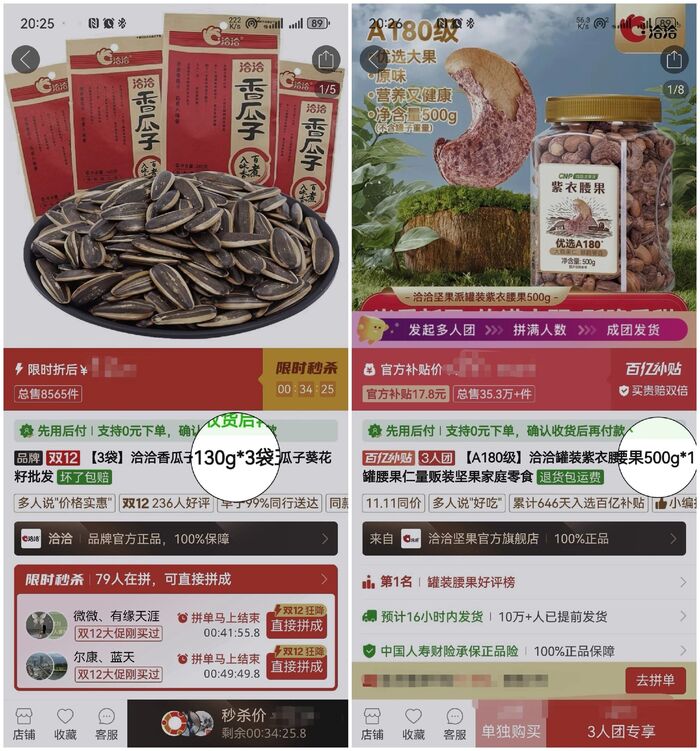 比如,在秒杀活动里,洽洽食品会铺一些小包拖袋类型的产品,客单价更低,也适合尝鲜。而在百亿补贴活动中,洽洽食品则主打200g、400g这样中大型规格的产品。