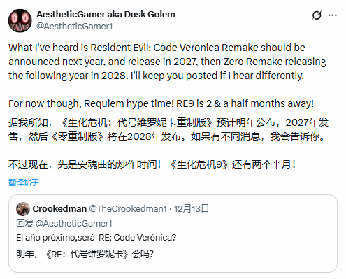Dusk Golem表示,《生化危机:代号维罗妮卡》重制版将在2027年发售,不过在此之前卡普空还是会将开发精力放在明年2月发售的《生化危机9 安魂曲》上。