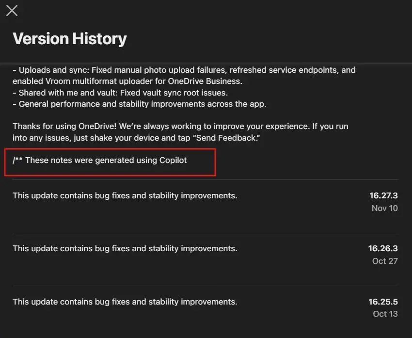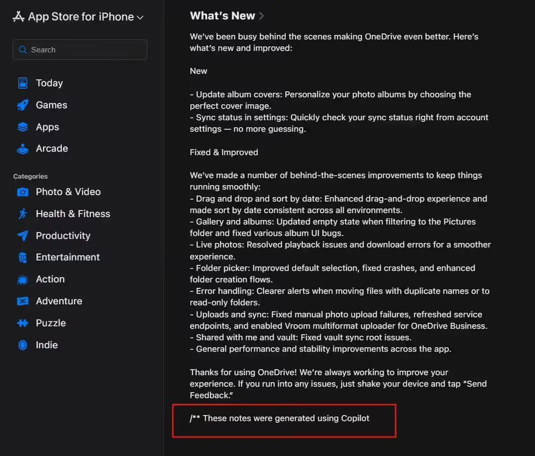 此外,Mac 版 OneDrive 应用的更新日志虽内容详尽,却并未提及由 Copilot 生成;而安卓平台的 Google Play 商店本身不显示版本历史,因此尚不清楚微软是否仅针对 iOS 应用(如 OneDrive)进行此类标注,抑或在其他平台遗漏了相关说明。