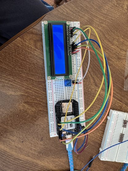 我使用一个电位器作为分压器来控制 LCD 对比度,中间引脚连接到 LCD 的 VO 引脚,一侧接 3.3 V,另一侧接地。然后在 LCD 由我的电脑供电的情况下,通过旋转电位器手动调整对比度。接线方式类似于下面的图 3(注意:由于初步引脚连接没有响应,后续迭代中接线发生了变化,不过该图用于视觉辅助)。
