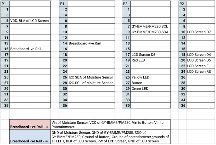 所有 PocketBeagle 引脚(P1 和 P2)到组件引脚(组件上的引脚或面包板上的引脚)的对应关系如下所示,便于参考。这些引脚是在我测试系统时,根据 PocketBeagle 哪些引脚有响应而决定的。