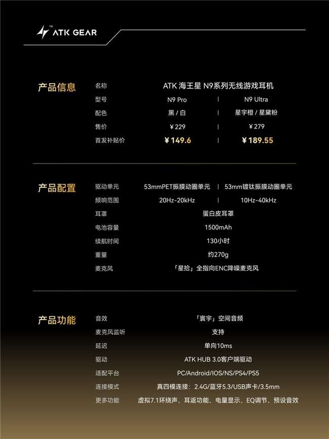 ATK海王星N9系列耳机,12月10日20:00 全平台开售,售价149元起。是百元价位段最具诚意、也最值得买的游戏耳机之一。