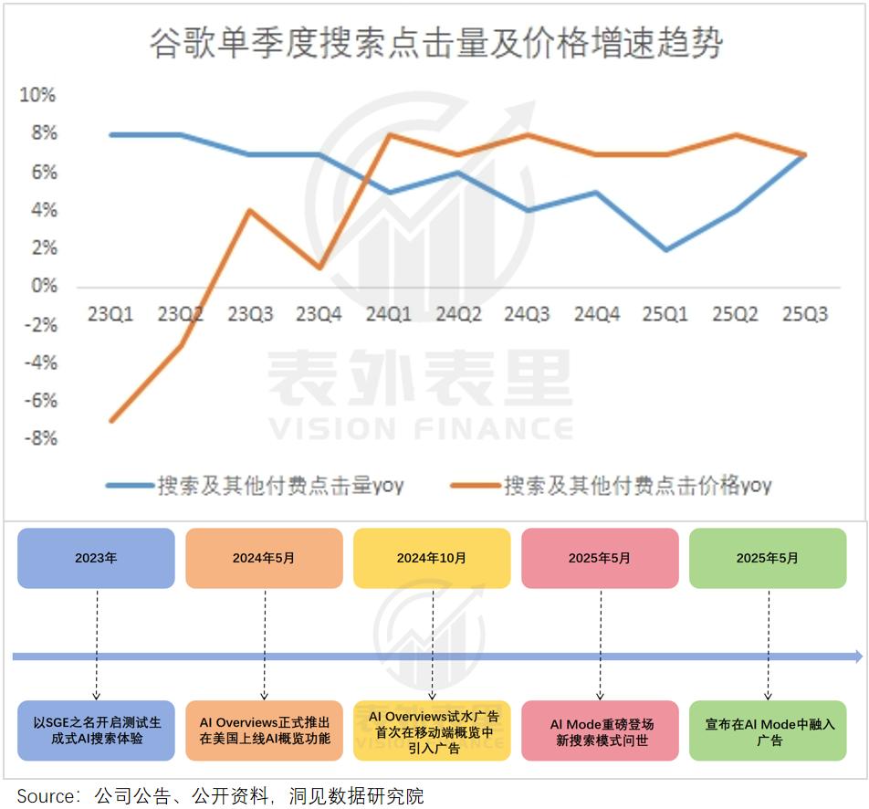 谷歌打破了沦为“AI第一批祭品”的魔咒。ChatGPT出现后,人们猛然发现:可以直接得到回答,搜索就失去了意义。谷歌整体流量与市场份额纷纷下滑,“现金奶牛”搜索广告业务面临被掀翻的风险。但冲击在这个夏天戛然而止。三季度,谷歌浏览器在搜索市场份额回升至90%,广告业务增速也止住了放缓趋势,连续两个季度加速增长。甚至,谷歌还做出了增量:一份海外研究显示,在聊天机器人访问量爆发式增长时,传统搜索引擎流量不降反增。这预示着,AI的崛起并没有“杀死搜索”,反而在实际数据中,把流量和广告“蛋糕”做大了。国内大厂的财报,看起来也似乎验证了这点:百度在搜索市场的份额,从跌破50%到重返60%+;腾讯最新一季,广告收入业务增长20%至358亿——但要说这些成绩来自AI,好像也没人相信。如大家所见,同样的数据向好,市场却并未像看好谷歌、英伟达一样,给予百度、腾讯们动辄几十倍的“AI溢价”,它们的市盈率仍在15倍上下挣扎。(当然也有美股泡沫的影响)“表外表里”以中美科技巨头的AI探索为主线,还原了搜索广告“困境反转”的过程,发现“AI驱动增长”的秘诀,就写在中美不同的牌面里。AI没有杀死搜索,反而做大了蛋糕“用户第一”被每一位产品经理奉为圭臬,只有搜索引擎,长期是“人适应工具”。搜索“怎么装修北欧风新房”,返回的是一堆风格设计网页,想要了解更多装修步骤、技巧,得提炼关键词进一步搜索。最后可能要浏览上百个网页,才能拼凑出答案。在Google、百度作为搜索代名词的20年里,“关键词匹配”是绕不开的核心,它迫使复杂问题被切碎,用户被训练成“提问机”。而这一定程度上是反人性的。在日常交流中,大家会自然问出“怎么装修北欧风新房”这样完整、复杂的长句,而非拆解成“北欧风设计要素”“装修步骤详解”。360的高管就提到:在传统搜索引擎的用户需求中,60%是求解各类问题,40%是寻找网址或资源。这意味着,互联网搜索赛道表面上成熟,底层能力始终与用户需求存在裂缝。尤其信息爆炸年代,即使是互联网原住民,也难以过滤参差不齐的内容。更不用说,那些玩不明白手机电脑的老年人、低文化水平人群,几乎没有文字搜索的能力。这块长期被掩盖的需求洼地,直到AI时代,才真正被看见、被回应。聊天机器人们,以自然对话+生成回答,打开了用户探索欲的开关。谷歌推出首款生成式AI产品SGE后,就发现“每天的搜索中,约有15%是以前没见过的,这一比例还在随着会话式体验的加入而增长”。但AI也不是万能的,毕竟人们搜索,不止追求高质量的答案,还享受“随便看看、意外发现”的惊喜;且追踪最新消息、寻找情感共鸣,AI也无法做到。说白了,AI并未改变搜索的本质,它只是切出了一块“新蛋糕”,并重构了信息获取的格局:AI以完整、复杂的回答,承接效率型、答案型、学习型的搜索需求;传统搜索引擎则以更开放、多元的内容,满足探索型、实时型和情感型的搜索需求。二者不是“你死我活”,而是互为补充,共同推高搜索体验的天花板。一份研究就显示,AI聊天助手流量爆发的时候,搜索引擎的体量并没有大受冲击。谷歌作为同时拥有浏览器和生成式AI的选手,无疑是这场变革中的“幸运儿”。当然,它也没有躺赢。升级推出的“AI概览”和“AI模式”,都放在浏览器搜索栏附近,既不改变传统搜索习惯,用户懒得看网页时,又能随时调用AI。同时,Google Lens和Circle to Search等功能,也大幅降低了使用门槛:哪怕是不会打字老年人,刷到不认识的物品、感兴趣的内容,随手一圈、一拍,便能直接获得结果。更重要的是,这种“传统浏览器+AI”的模式自带流量,比起ChatGPT独立App、new Bing另辟聊天窗口的做法,几乎是不声不响地转化了数十亿用户。尤其谷歌还足够“便宜”——ChatGPT、Claude等聊天机器人,会员费动辄20刀/月,不买单几乎寸步难行。因此即使它们的智能化水平,远高于还未全面接入Gemini的谷歌浏览器,用户仍用脚投票。谷歌2025Q3财报显示,AI概览已覆盖超20亿用户,AI模式日活超7500万人。这正是谷歌比国内AI公司“命好”的地方。百度同样将AI嵌入搜索引擎,然而国内大大小小的AI搜索应用层出不穷,且个个免费,无不使出浑身解数抢夺用户。于是,相比聚焦问答的谷歌,国内玩家集体陷入了“功能内卷”:无论是浏览器,还是聊天机器人,都是既能解读本地文件,还支持文生图和AI编程等,主打一个“全能”。但如此一来,眼花缭乱的功能,也一定程度上影响了使用体验,让部分用户无所适从。更何况,各家的功能也难分高下——要论流量和内容,百度有搜索引擎,元宝捆绑微信,千问有夸克浏览器、豆包背靠抖音,家家皆有一块根据地,且谁也无法做到打通。尤其是百度,多年来商业化对内容生态的打扰,此刻也像一颗子弹正中眉心。反观谷歌,从浏览器、视频网站、办公软件到地图等,MAU超20亿的产品多达6款,自己活成了“垄断”课代表。这种强大的生态优势百度羡慕不来,也是谷歌 搜索广告业务 快速扭转颓势的关键所在。广告断了“一臂”,但长出了更强壮的AI今年7月,曾与谷歌亲密无间的欧洲独立出版商们,一纸诉状把谷歌送上了被告席。矛头指向谷歌搜索的AI概览,这一模式下,用户点击率从15%腰斩至8%,被AI引用的源网站点击率也低至1%,创作者和企业投放的内容陷入了“没人看”的危机。市场也忧心忡忡:“点击”是谷歌万亿美