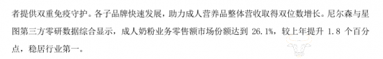 可以看出,张小东在乳制品行业工作了近三十年,积累了丰富的经验,伊利集团成人营养品业务的发展离不开他的努力。财报数据显示,伊利集团今年前三季度奶粉及奶制品业务营业收入达到242.61亿元,同比增长13.74%,再创历史新高,其中成人奶粉业务保持双位数增长。而在半年报中,伊利集团表示,公司成人奶粉业务零售额市场份额达到26.1%,较上年提升1.8个百分点,稳居行业第一。