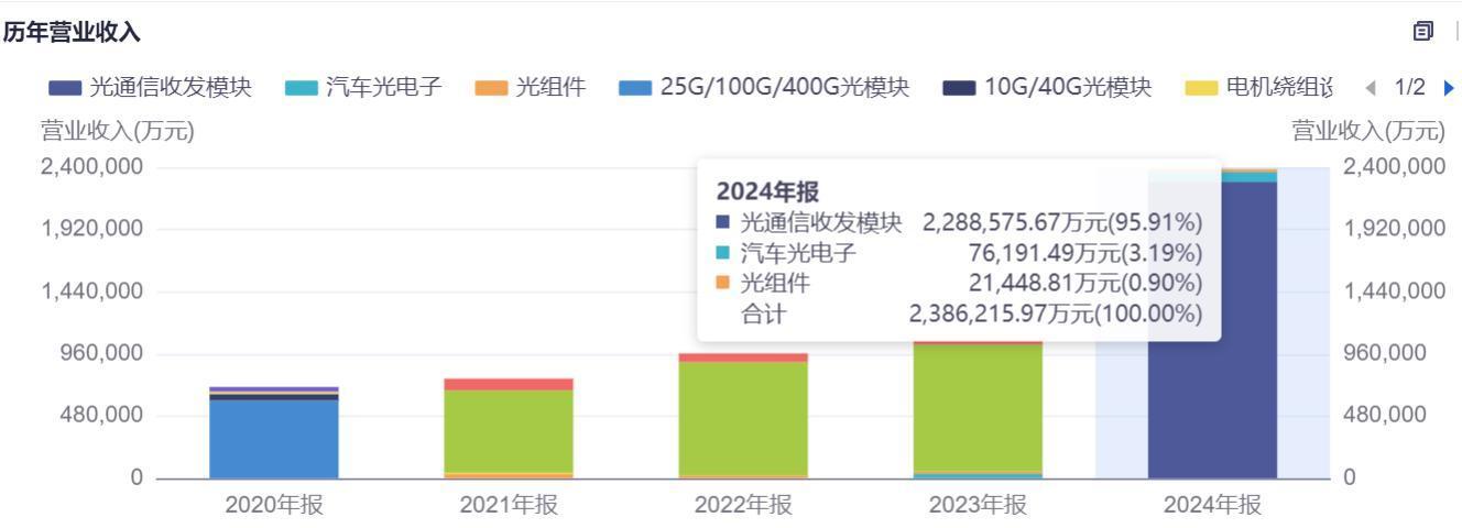 早在2020年,中际旭创就在业内率先推出800G可插拔光模块,领先竞争对手一年。2024年营收占比中,光通信收发模块占比高达95%以上,其中800G等高端产品是绝对主力。