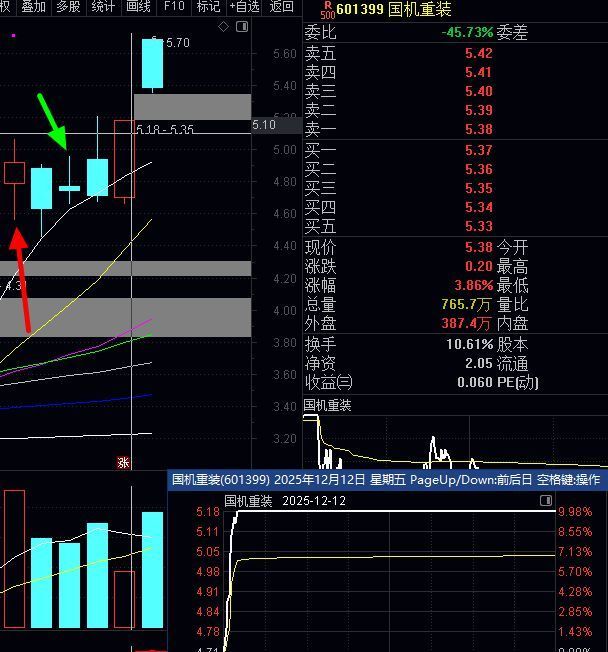 12月8号,尾盘潜伏的:国机重装,次日第2天大跌洗盘被套,第3天高开最高点出局,扭亏为盈,后面又是2个涨停20%