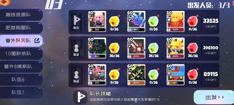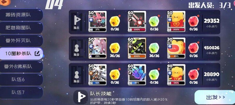 队长选择三叉,主输出用青橘,搭配灯和云作为宠物,其余配置可自由调整。挑战困难关卡时需重点提升青橘血量,建议不低于6000,否则其技能召唤的橘子难以承伤。我用的方糖与夜离阵容一致,若有条件建议全员堆血。附图为参考配置。