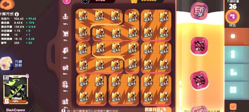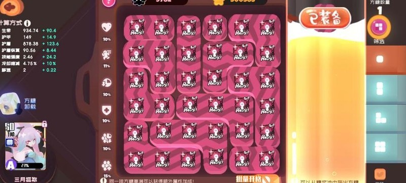 主力输出用粉狐,队长选妖炽,搭配白绒绒和宠物654鸡块。辅助位装备无要求,只需进场释放技能即可。主力全技能配方糖,若方糖不足,可用四阶、三阶、二阶补满。武器名称不详,血型选B型并堆满,方糖主选爆伤属性。升阶时只升一阶,洗出一个A级攻击词条即可。最终武器总攻击力达到1900,刚好可秒杀BOSS。下方附上方糖配置图。