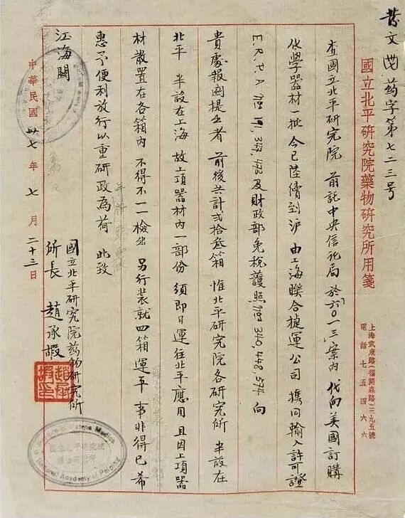 1948年7月23日,赵承嘏致函海关协调国立北平研究院向美国订购的化学器材即日需分装运往北平的相关事项。图片来源:中国科学院上海药物研究所