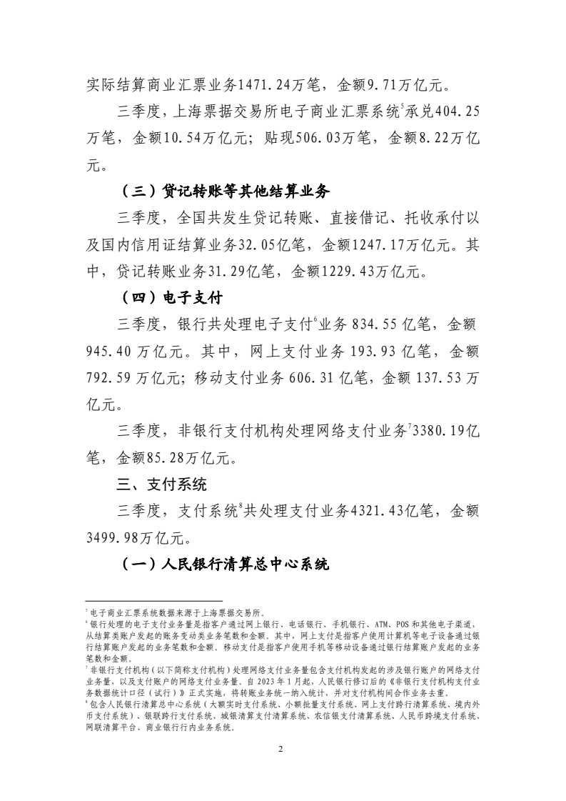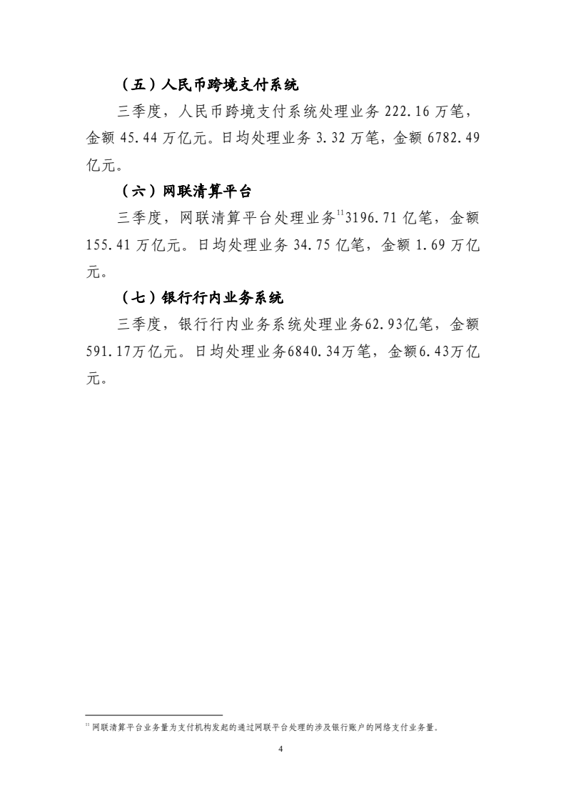 支付系统方面,三季度总处理4321.43亿笔、3499.98万亿元。人民银行清算总中心处理56.84亿笔、2632.51万亿元;网联平台业务量113196.71亿笔、155.41万亿元;银联系统处理1000.10亿笔、73.57万亿元。