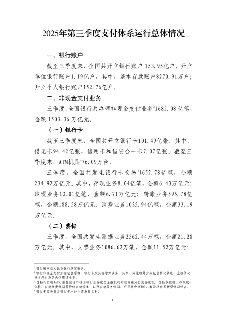 截至2025年三季度末,全国已开立银行账户1153.95亿户,其中单位账户1.19亿户、个人账户152.76亿户。