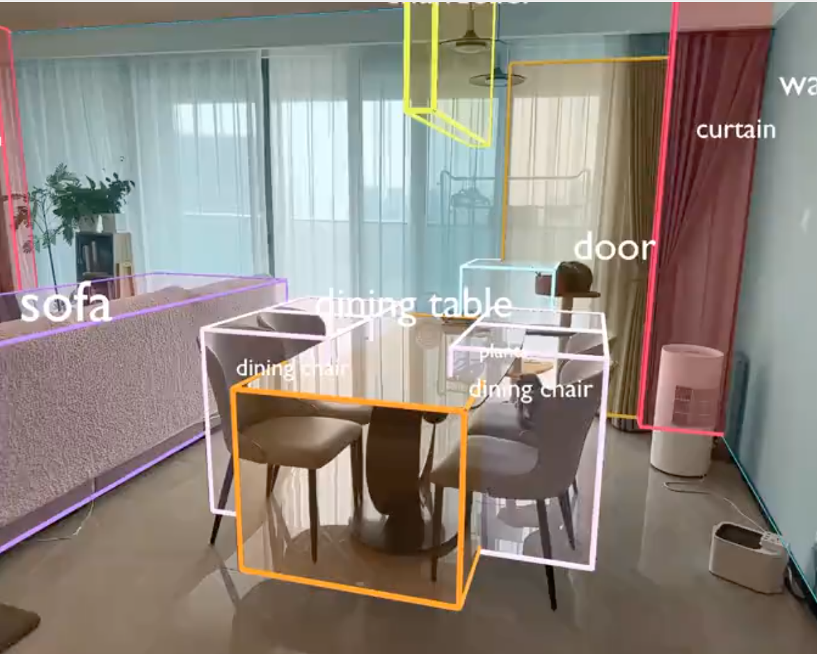通过学习群核数据库中成千上万种真实的室内布局和物品摆放逻辑,机器人可以获得一种「上帝视角」般的先验知识。龙天泽透露,群核已经在做机器人导航中的 3D 物品视觉理解 。这意味着,未来的机器人不仅能「看见」障碍物,还能通过接入 Aholo 的模型,瞬间做出判断: