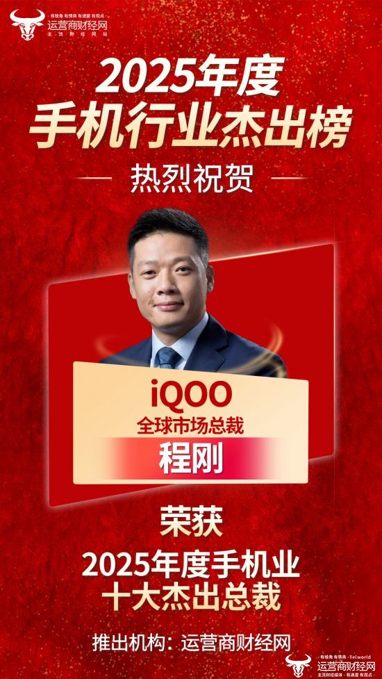 iQOO 全球市场总裁 程刚凭借优秀的表现,被评选为“2025年度手机业十大杰出总裁”。