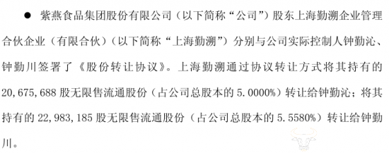 此外,紫燕食品还披露了一份内部协议转让股份的公告。公告显示,公司股东上海勤溯通过协议转让方式将其持有的股份转让给钟勤川、钟勤沁,而二人为紫燕食品创始人、实际控制人钟怀军的子女。其中上海勤溯将2067.51万股股份转让给钟勤沁,转让价款3.38亿元,将2298.32万股股份转让给钟勤川,转让价款3.76亿元。