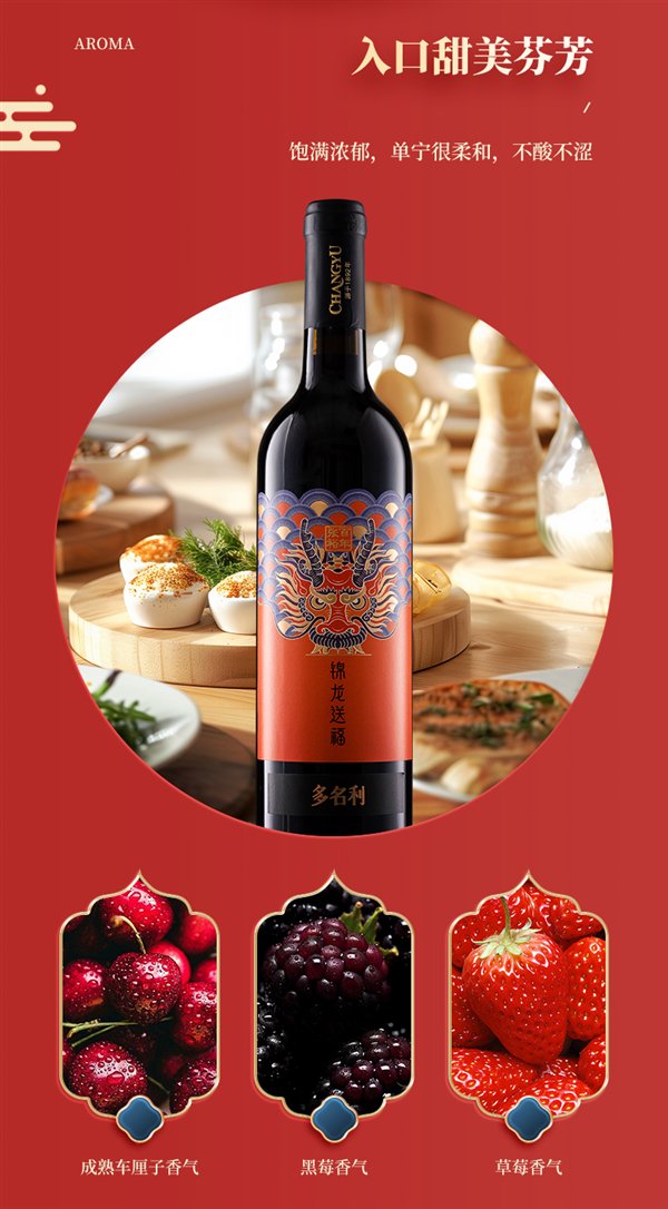 酒体呈宝石红色,酒液入口甜美芬芳,柔顺适口,轻松畅饮。