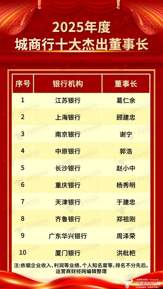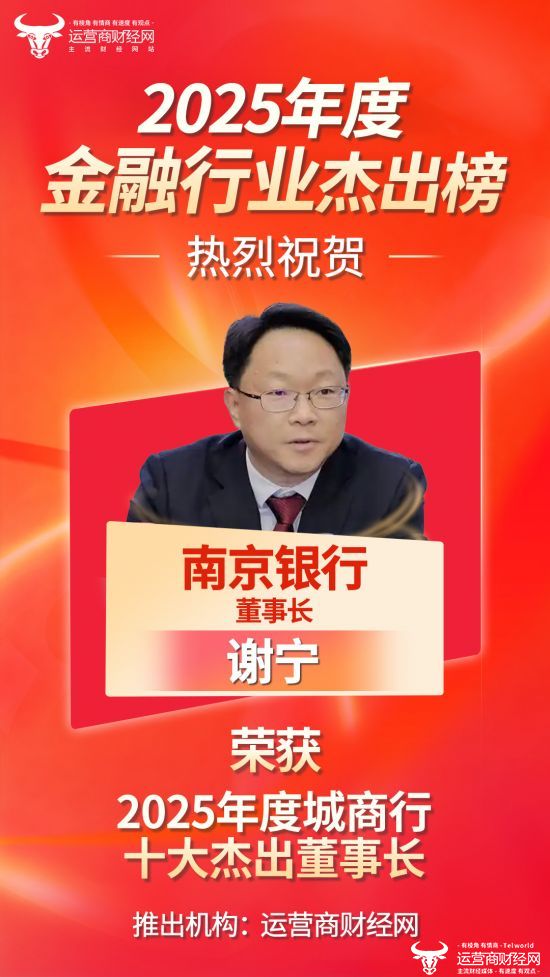 运营商财经网副总经理康锐认为,高质量发展的背后与董事长谢宁的管理的密不可分。因此,南京银行谢宁成功登上“2025年度城商行十大杰出董事长”榜单,热烈祝贺!