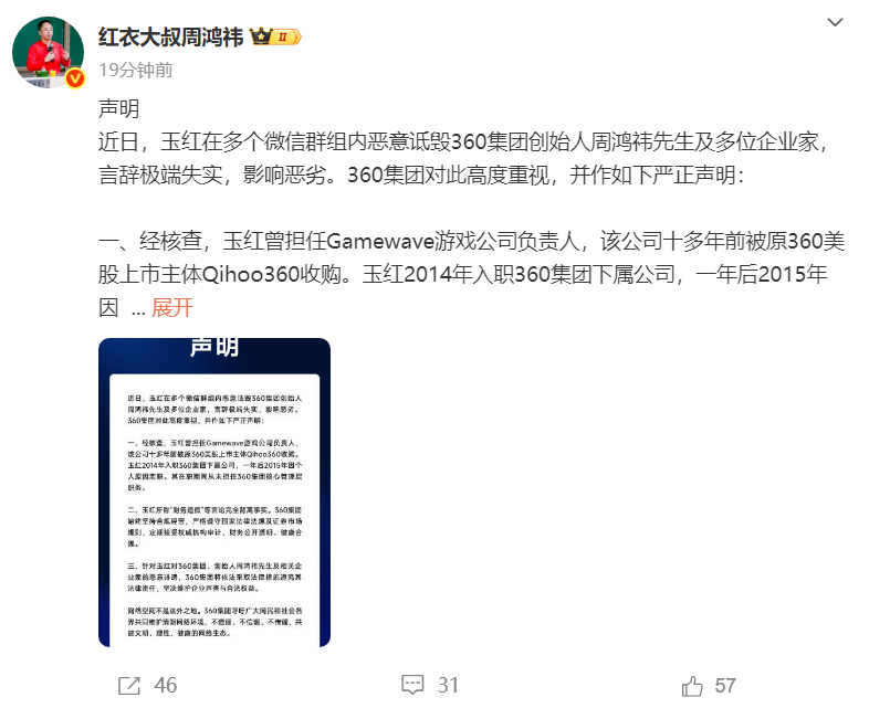 12月16日,360集团创始人、董事长周鸿祎发布声明:近日,玉红在多个微信群组内恶意诋毁360集团创始人周鸿祎先生及多位企业家,言辞极端失实,影响恶劣。