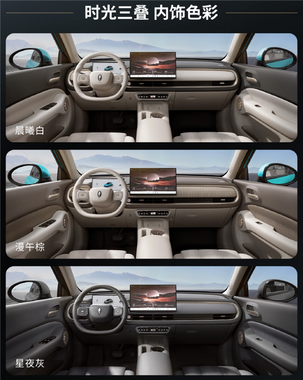 车内设计简约明快,配有纯色双辐式方向盘、全系搭配10.25液晶仪表盘和15.6英寸中控屏,空调出风口下方保留部分物理拨杆,样式复古。