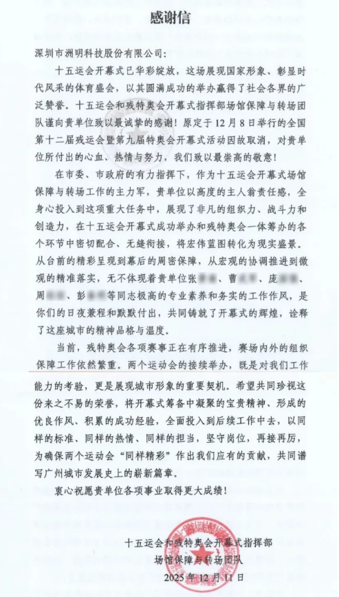 近日,洲明科技收到了一封来自全运会官方的感谢信。信中对洲明在十五运会及残特奥会期间所提供的光显服务给予充分肯定,也对团队在高强度、长周期、多场景任务中的专业表现致以感谢。