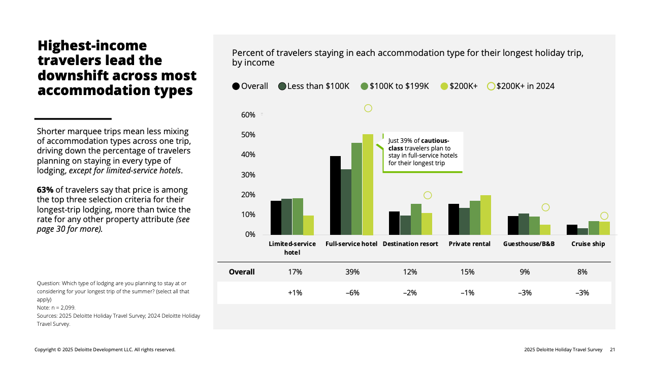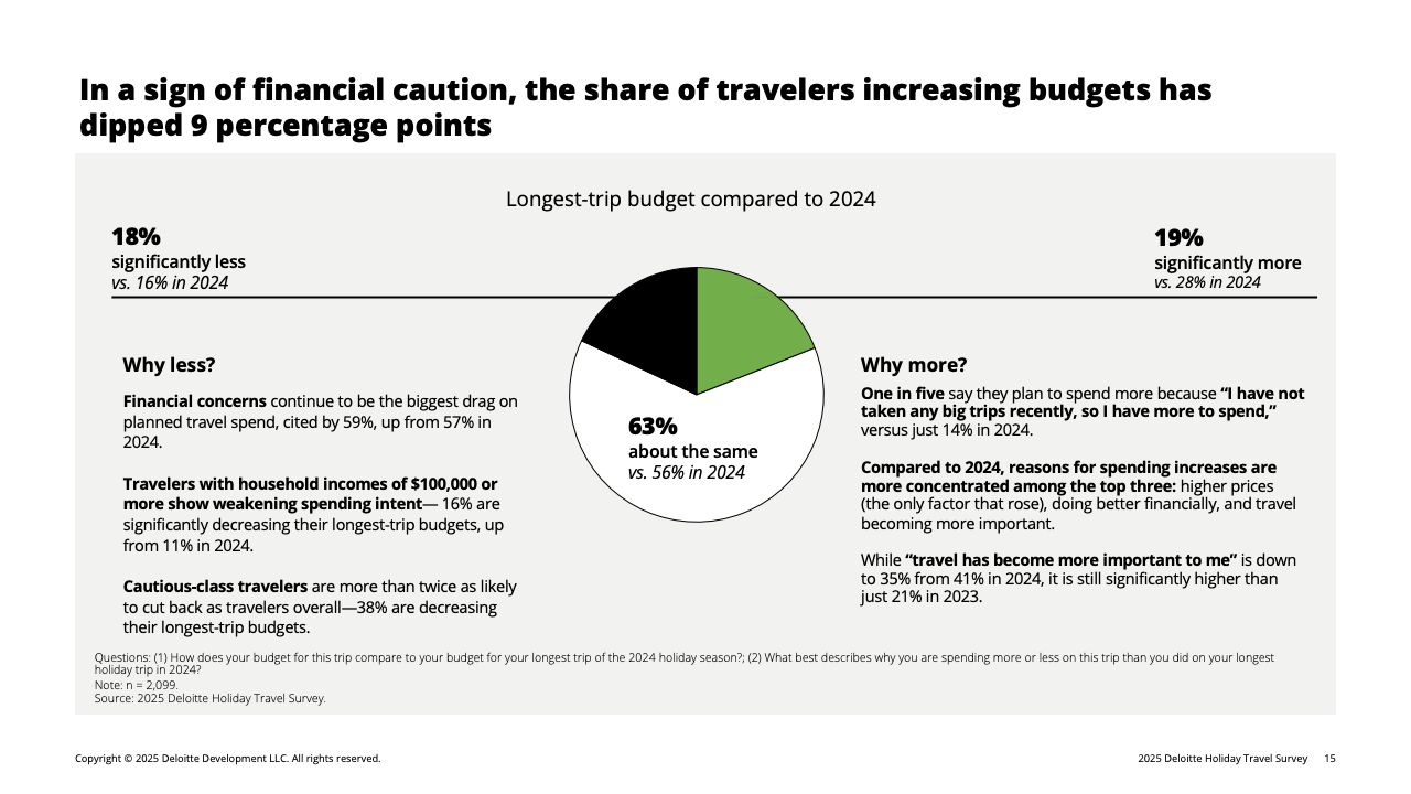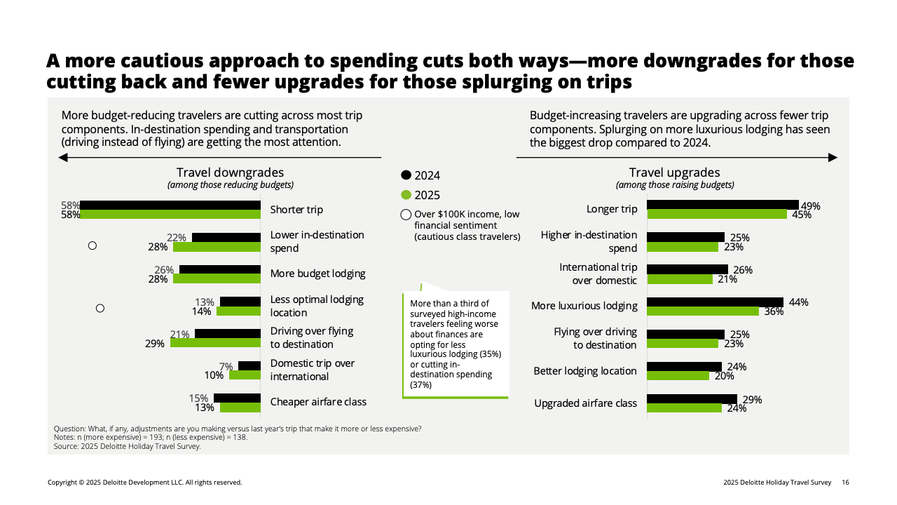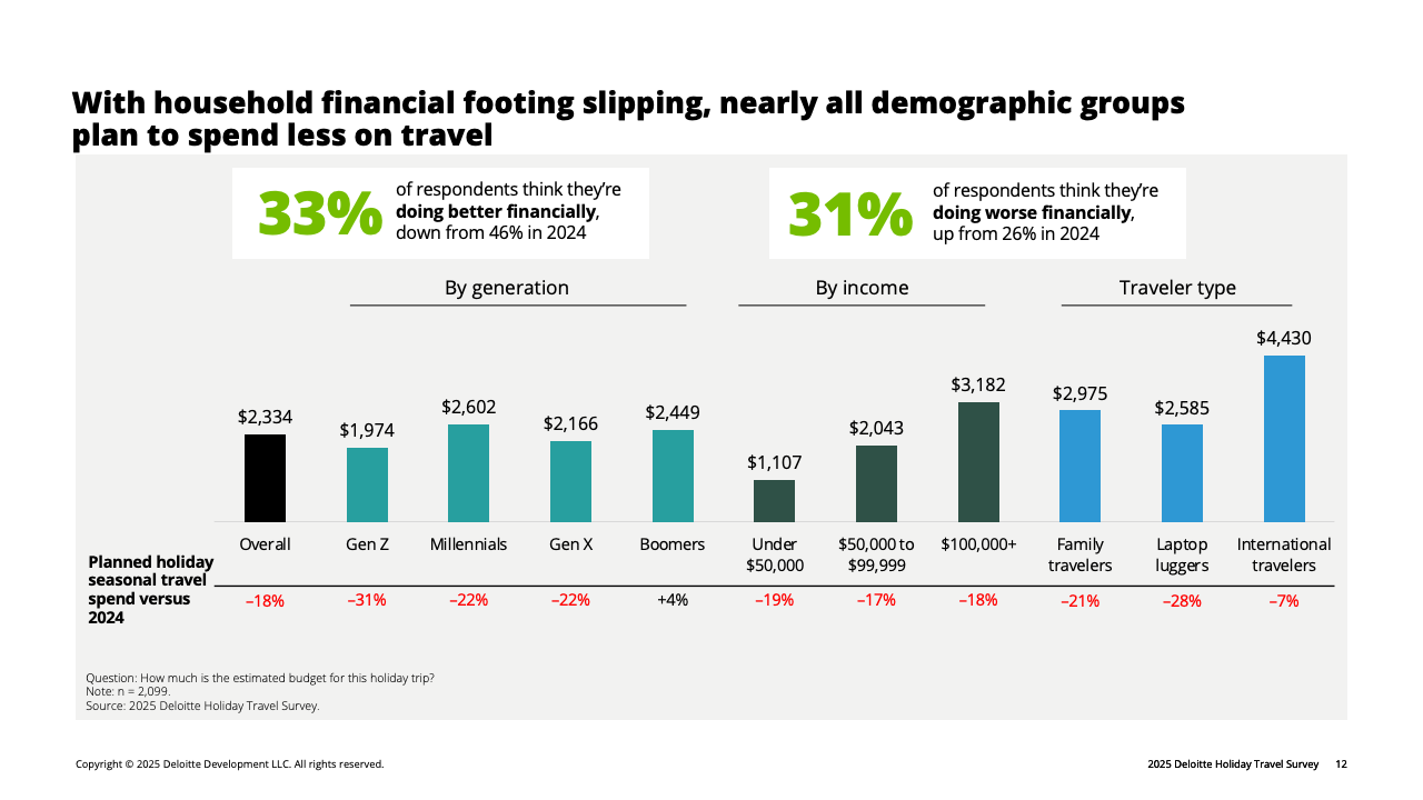 推动消费收缩的核心因素是财务情绪转弱。全体受访者中,有31%认为自己的财务状况较去年变差,高于去年的26%。这种负面情绪在高收入群体中放大:收入10万美元以上者中,19%自评“变差”,显著高于2024年的13%。在这一被称为“谨慎阶层”的群体中,80%的高收入旅客明确表示将主动压低旅行预算,而他们平日正是旅游消费的主力。受其影响,高端酒店、长途航班及目的地付费活动等品类在今年假期普遍面临需求回落。