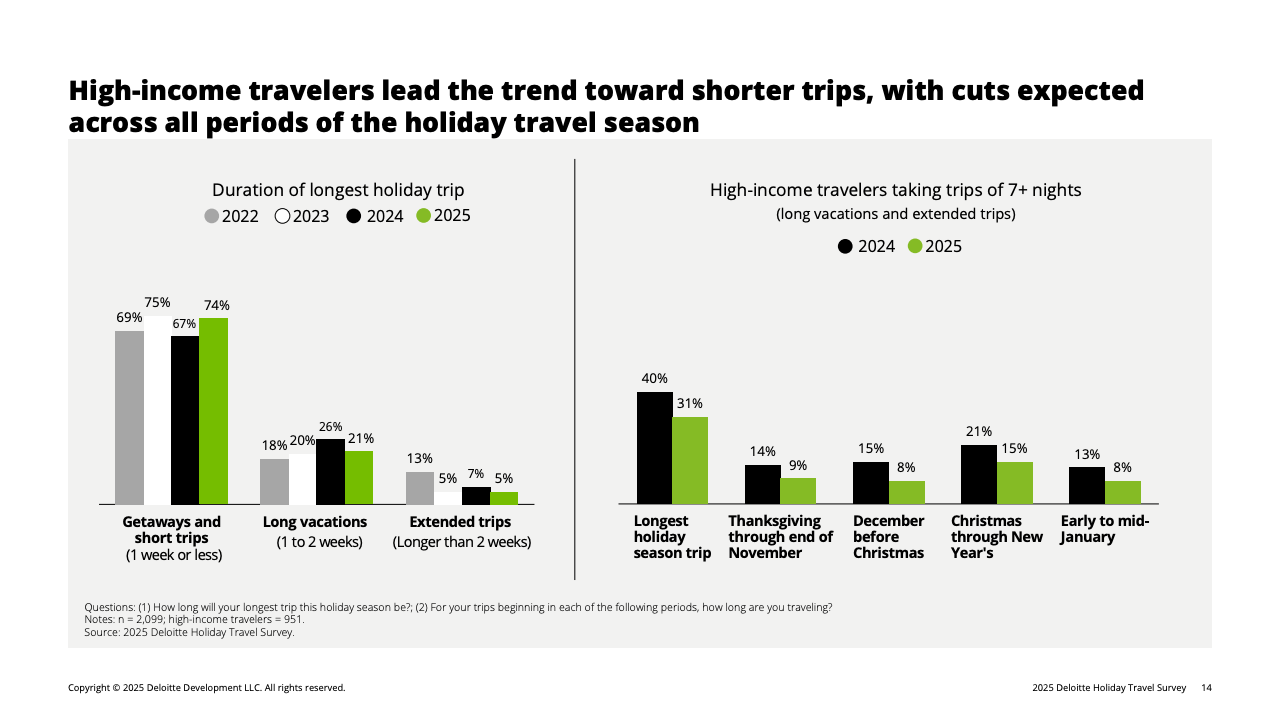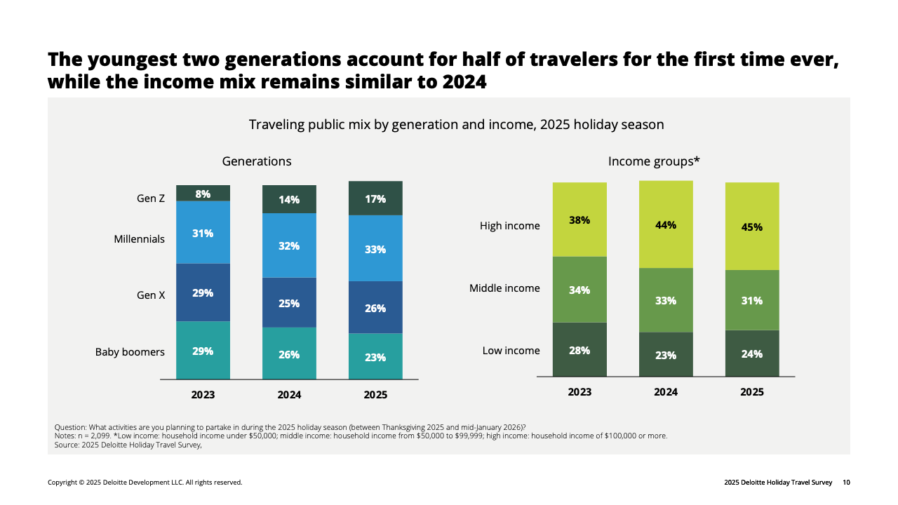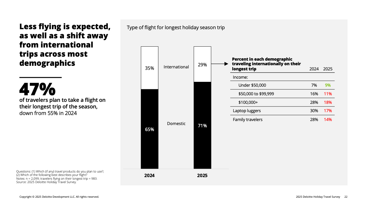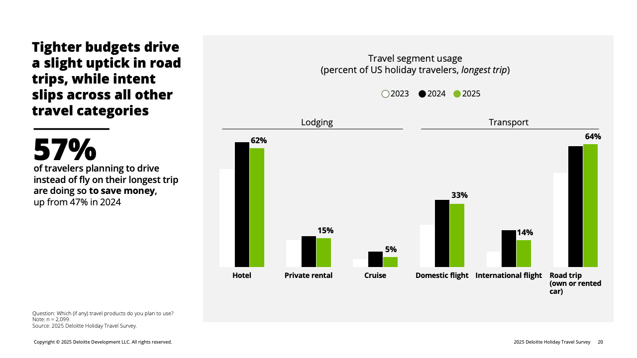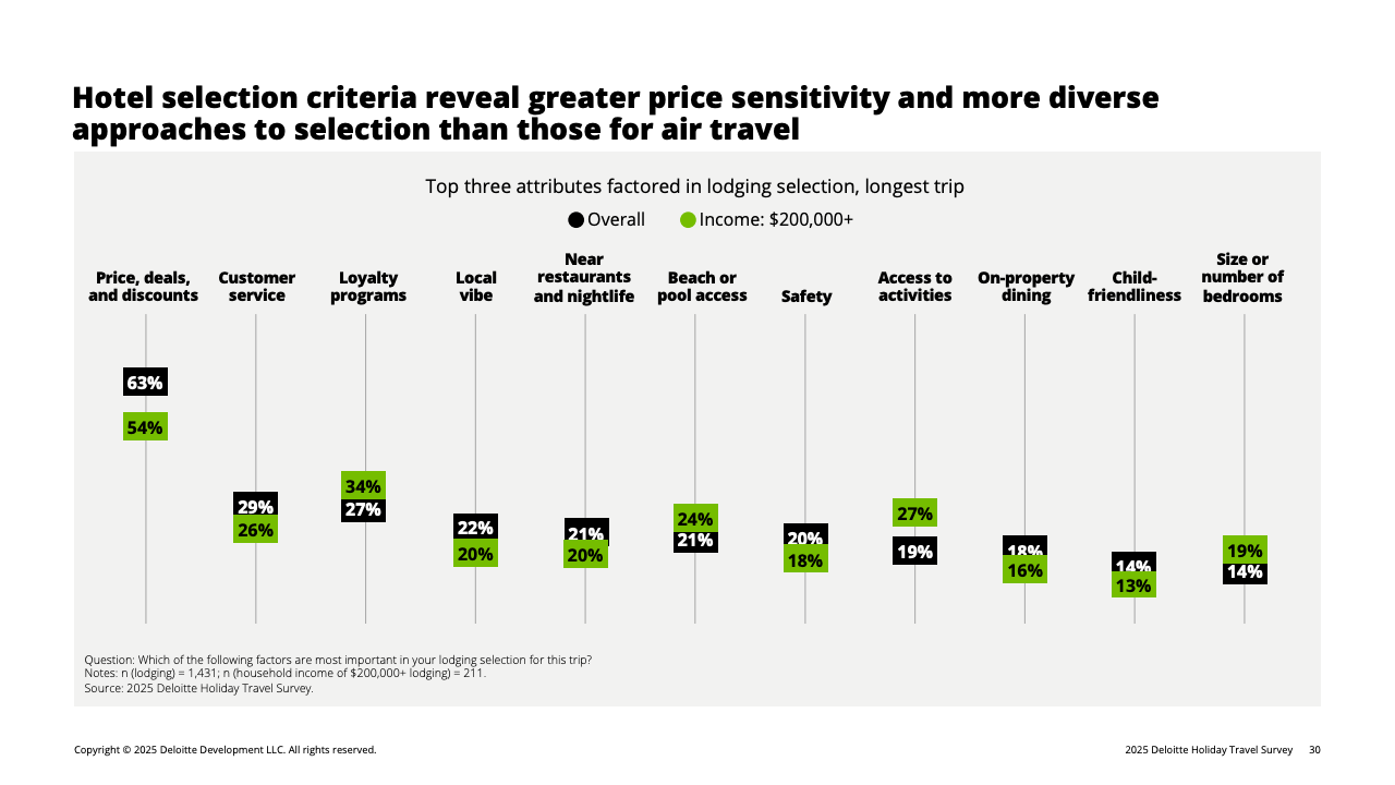 推动消费收缩的核心因素是财务情绪转弱。全体受访者中,有31%认为自己的财务状况较去年变差,高于去年的26%。这种负面情绪在高收入群体中放大:收入10万美元以上者中,19%自评“变差”,显著高于2024年的13%。在这一被称为“谨慎阶层”的群体中,80%的高收入旅客明确表示将主动压低旅行预算,而他们平日正是旅游消费的主力。受其影响,高端酒店、长途航班及目的地付费活动等品类在今年假期普遍面临需求回落。