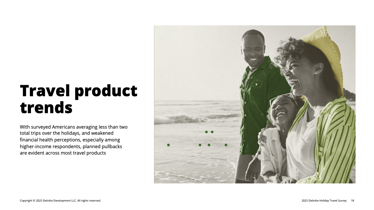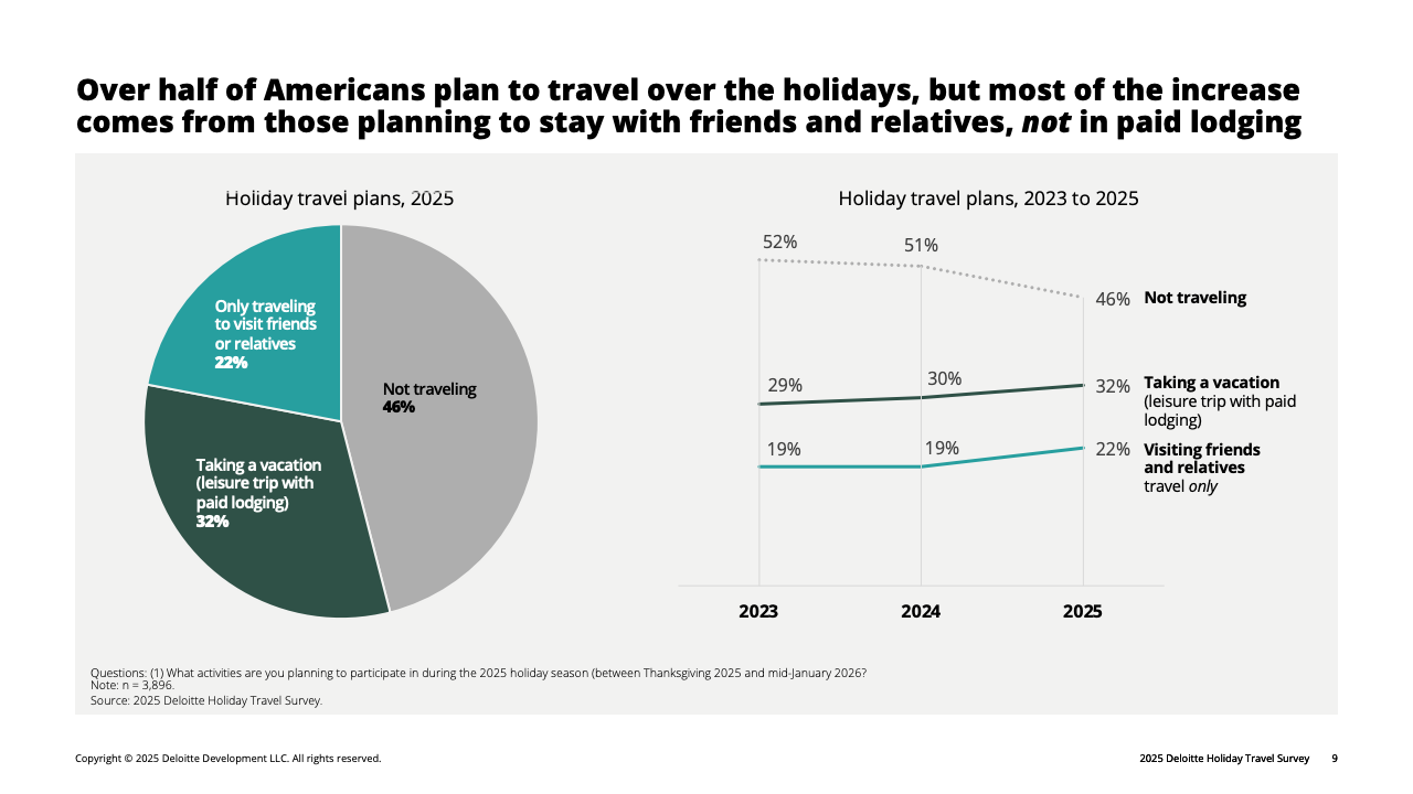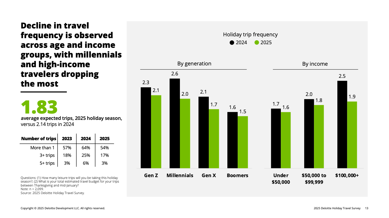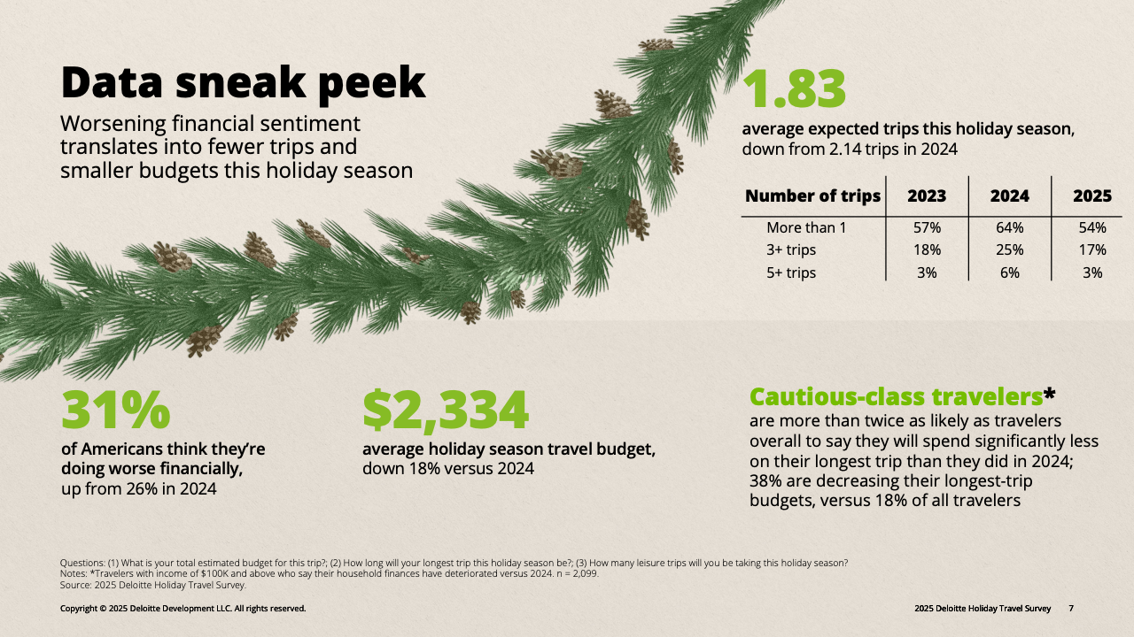 今年美国假日旅行意愿上升,但整体消费却呈明显降温。根据报告显示,超过一半的美国人计划在感恩节至1月中旬间出行,创五年新高。然而,这一增长主要来自免费住宿的探亲访友,付费度假旅行占比并未显著扩大。更关键的是,旅行动机虽仍强烈,但实际行为趋于节制。美国消费者的假日平均旅行预算降至2334美元,同比减少18%;平均计划出行次数从2.14次降至1.83次。多数旅客在缩短旅程、减少飞行并压缩住宿成本,形成“出行热情不减、但钱包更紧”的新格局。