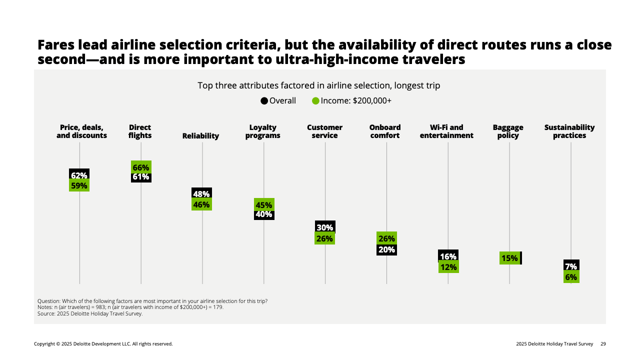 尽管大环境趋于节制,但仍有四分之一旅客符合“奢华旅行”定义。他们的消费行为呈现逆势特征:预订头等舱的概率是普通旅客的两倍,在选择酒店时更注重服务质量、房间舒适度与忠诚计划价值。然而,即便在这群高消费人群中,财务预期不佳者的降级行为也在增加,反映消费升级需求在今年并不具备普遍性。