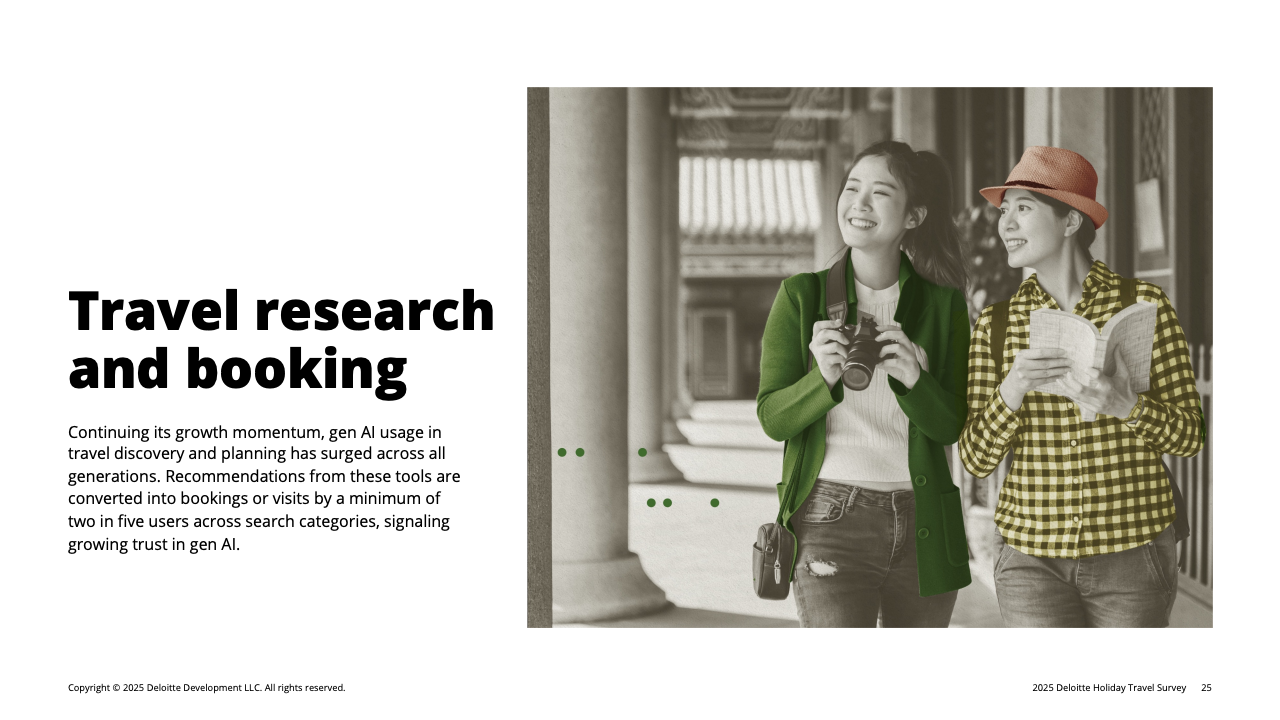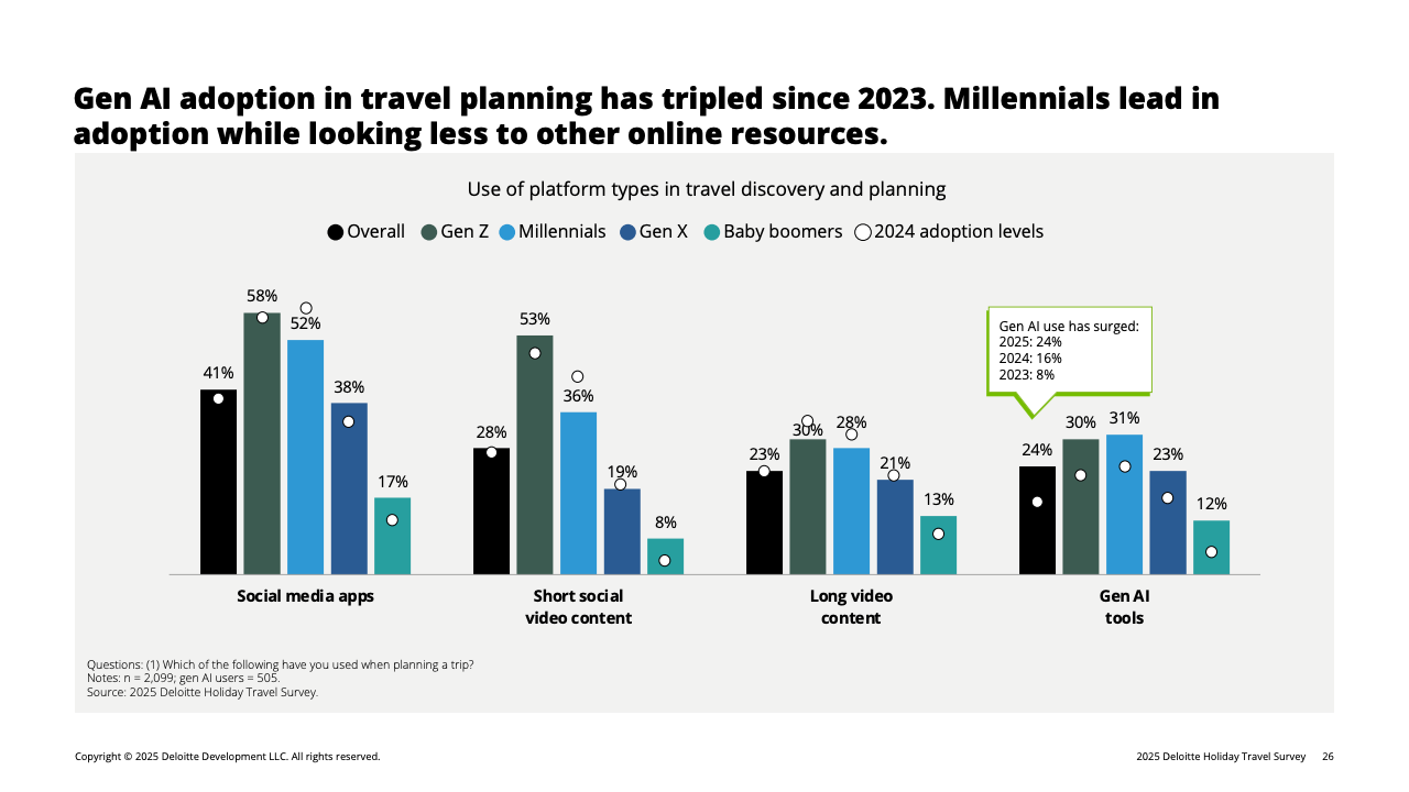 与此同时,美国假日旅客结构出现明显“代际转换”。Z世代与千禧一代首次占到全部旅客的一半,其中千禧一代贡献最高的平均预算,达2602美元。年轻群体的崛起不仅提升旅行动机,也重塑旅行决策方式。超过半数Z世代依赖短视频平台获取灵感,生成式AI在所有年龄段中的使用率同比增长1.5倍,其中以千禧一代最为活跃。这意味着旅游企业未来竞争将更依赖技术触达与内容分发能力,而非传统营销渠道。