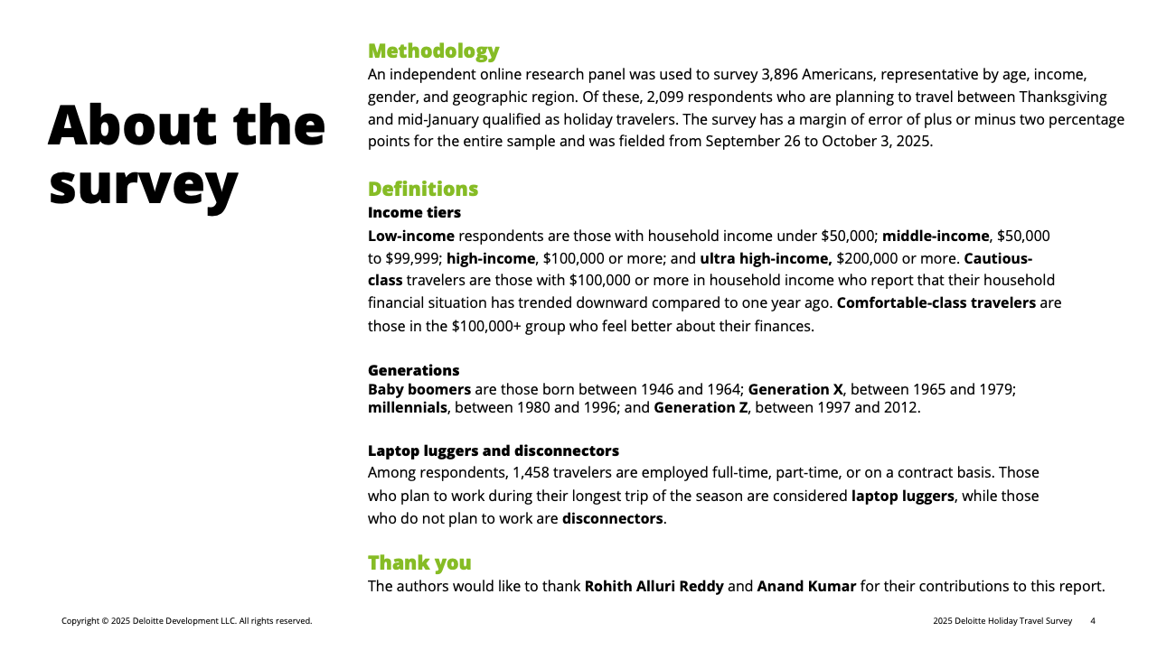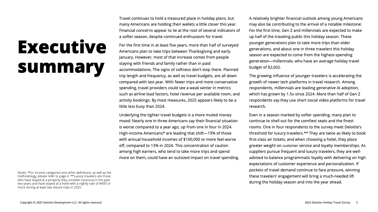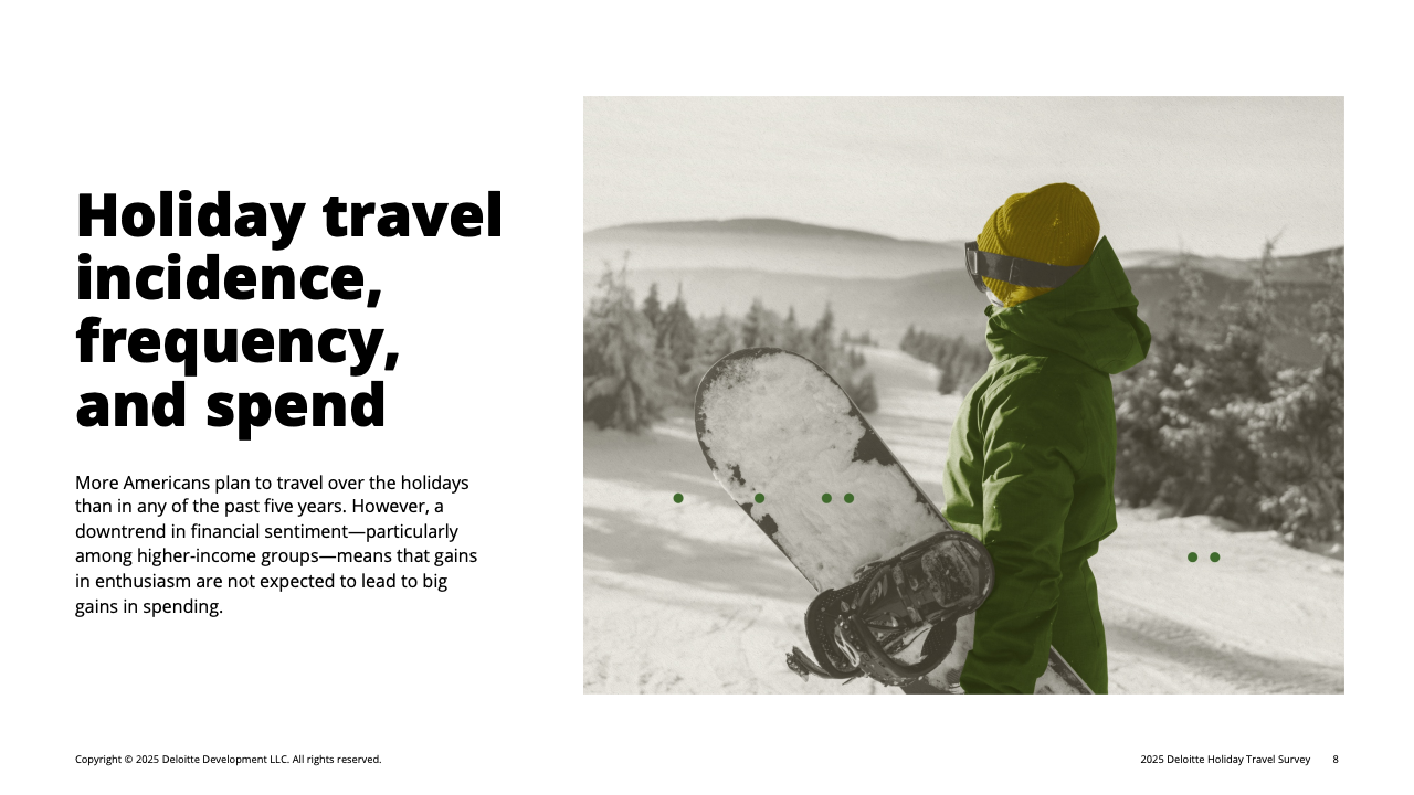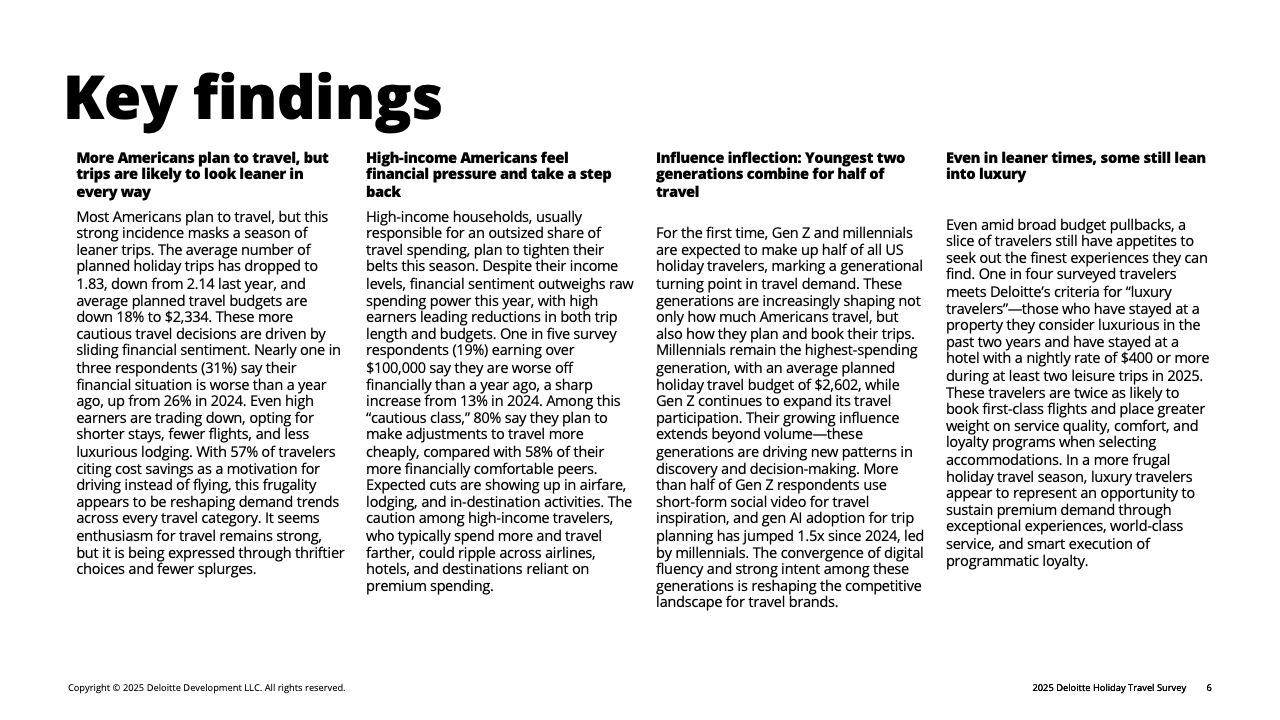总体来看,2025年美国假日旅行呈现“量升质降”的特点:意愿提高,但停留更短、预算更低、飞行减少、付费活动缩减。随着高收入群体持续承压、年轻群体影响力扩大、AI辅助决策普及,旅行行业或将进入一个以“节制、数字化与双极分化”为关键特征的新周期。未来数季,旅游企业如欲维持收益,需在控价策略、忠诚体系与差异化体验之间取得更精细的平衡。