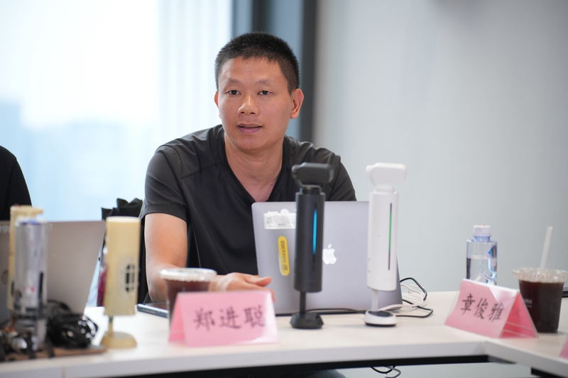 影石Insta360硬件产品经理郑进聪接受采访时,AI录音麦克风的摄像头随着他的声音追踪人像。新京报贝壳财经记者 罗亦丹 摄