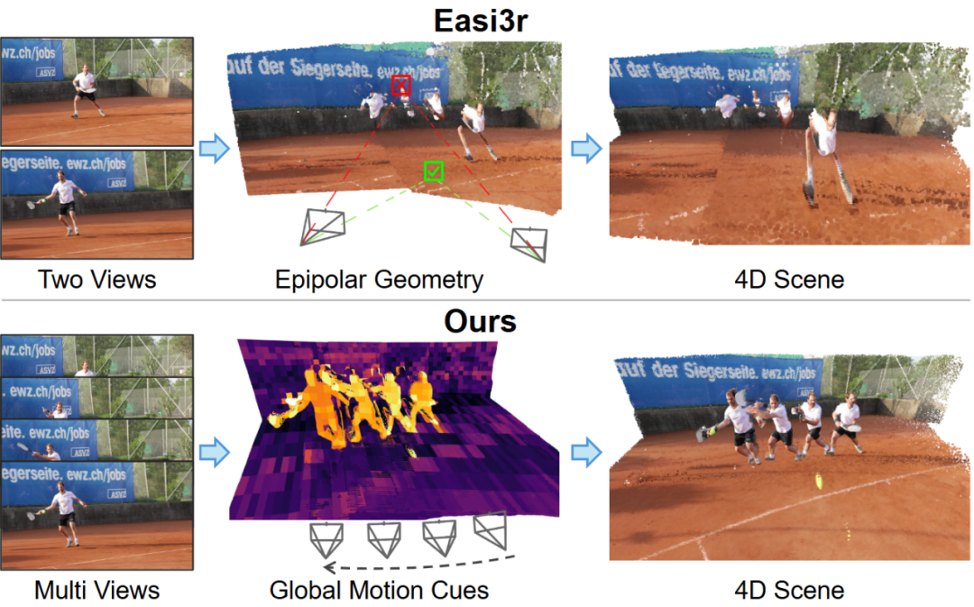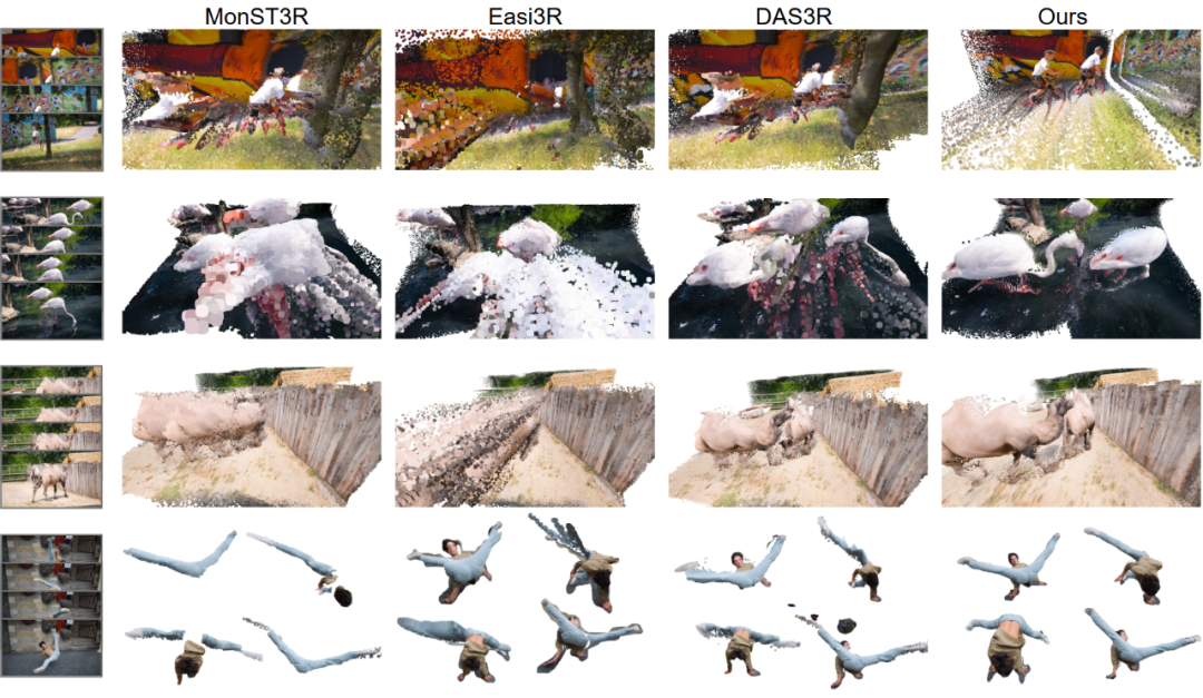近年来,以 VGGT、DUSt3R 为代表的 3D 基础模型在静态场景重建中表现出色。然而,面对包含移动物体(如行人、车辆)的动态 4D 场景时,这些模型的性能往往显著下降。动态物体的运动不仅干扰背景几何建模,还会导致严重的相机位姿漂移。