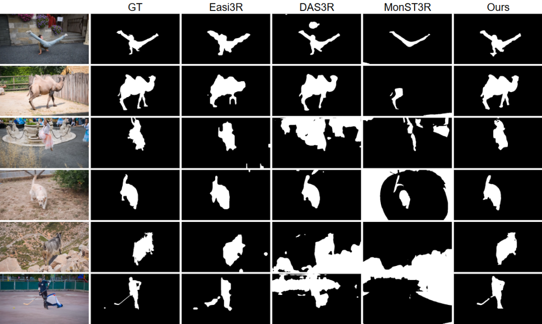 定性分析:定性结果清晰地展示了基线方法的不足:Easi3R 的掩码较为粗糙且遗漏细节;DAS3R 倾向于过度分割并渗入静态背景;MonST3R 则常常分割不足。相比之下,VGGT4D 生成的掩码更加准确,且边界更加清晰。这些结果有力地验证了研究团队的假设:VGGT 的 Gram 相似度统计信息中嵌入了丰富的、可提取的运动线索。