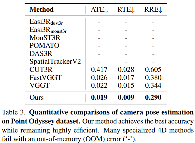 长序列鲁棒性突破:在极具挑战性的长序列 Point Odyssey 基准测试中,VGGT4D 在所有指标上均取得了最佳结果,同时保持了高度效率。许多其他 4D 方法由于内存不足(OOM)错误甚至无法在该 500 帧序列上运行。这表明 VGGT4D 提出的显式、无需训练的动态 - 静态分离方法成功地识别并消除了由运动引起的残余位姿不一致性,从而实现了更稳定、更准确的相机轨迹,尤其是在长且复杂的序列上。