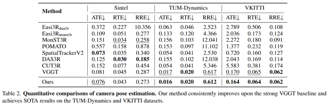 强大的基线与持续改进:数据表明,原始 VGGT 已经是一个非常强大的基线,其自身就优于 MonST3R、DAS3R 等许多专门的 4D 重建方法。这表明 VGGT 的预训练隐式地使其对动态物体具有一定的鲁棒性。然而,这种鲁棒性并不完美。 VGGT4D 在所有数据集上均持续改进了这一强大的 VGGT 基线。例如在 VKITTI 数据集上,VGGT4D 的 ATE 仅为 0.164,而 MonST3R 高达 2.272。