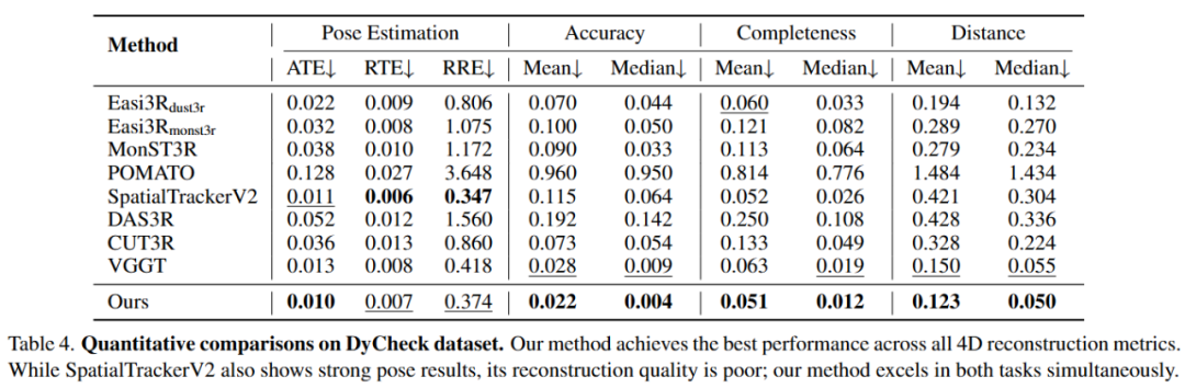研究团队针对动态物体分割、相机位姿估计和 4D 点云重建三大核心任务,在六个基准数据集上进行了详尽的定量和定性评估。