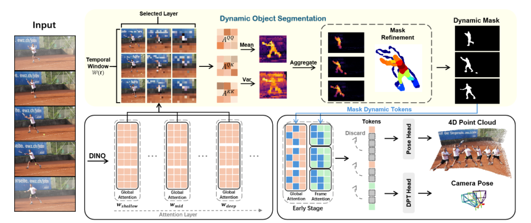 VGGT4D 提出了一种早期阶段干预策略:仅在浅层抑制动态 Token 的 Key 向量。这种设计既在早期切断了动态信息对深层几何推理的影响,又保证了深层 Transformer Block 依然在其预训练的特征流形上运行,从而保证了位姿估计的鲁棒性。