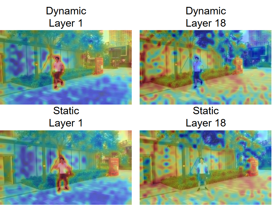 研究人员对 VGGT 的注意力机制进行了可视化分析,观察到一个关键现象:VGGT 的不同网络层对动态区域表现出截然不同的响应模式。