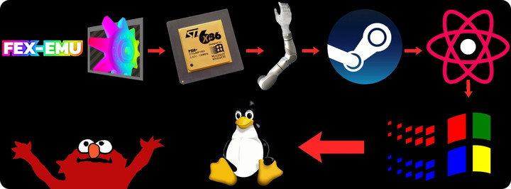 - FEX 首先工作,在 ARM 处理器上搭建一个 x86 的指令环境,从而让 SteamOS 正常启动
