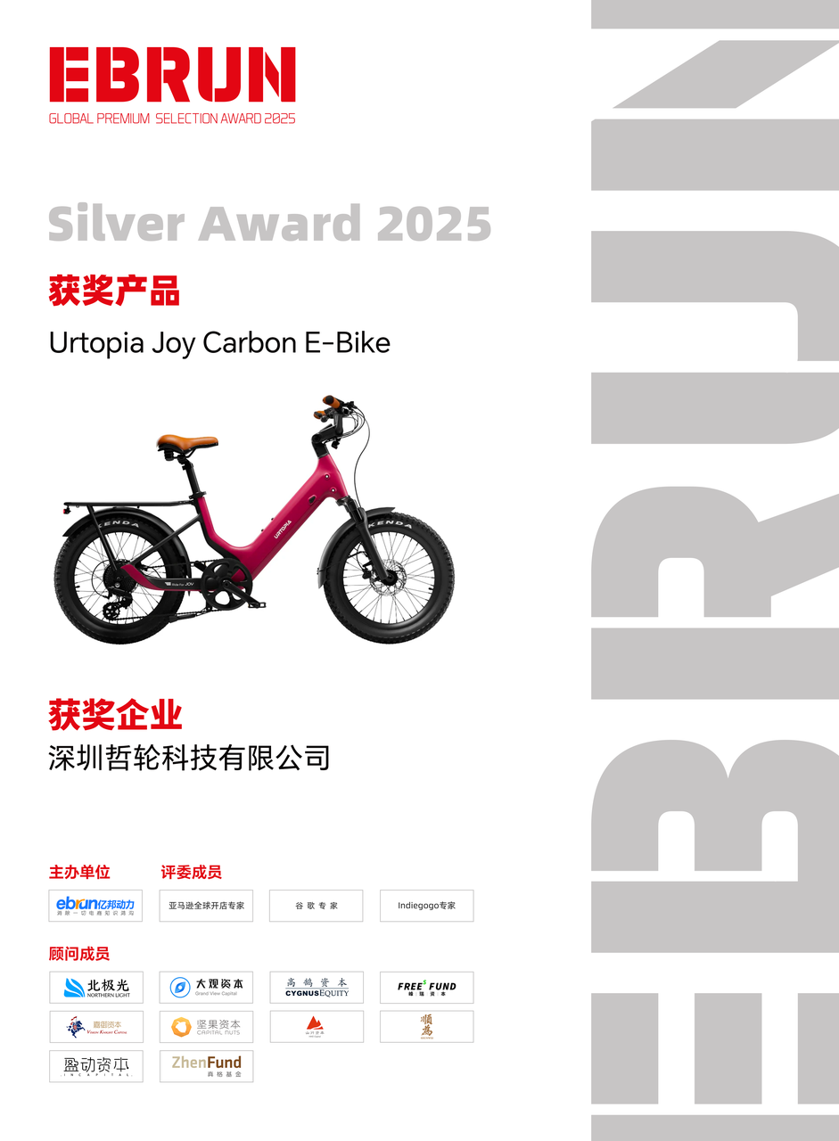在激烈的角逐中,全球智能电助力单车领域的创新先锋Urtopia(深圳哲轮科技有限公司)凭借其在碳纤维工艺与智能骑行体验上的卓越突破脱颖而出。其年度全能新品 “Urtopia Joy Carbon E-Bike” 经过层层评审,成功斩获2025届重要奖项——EBRUN全球好物Silver Award 2025。