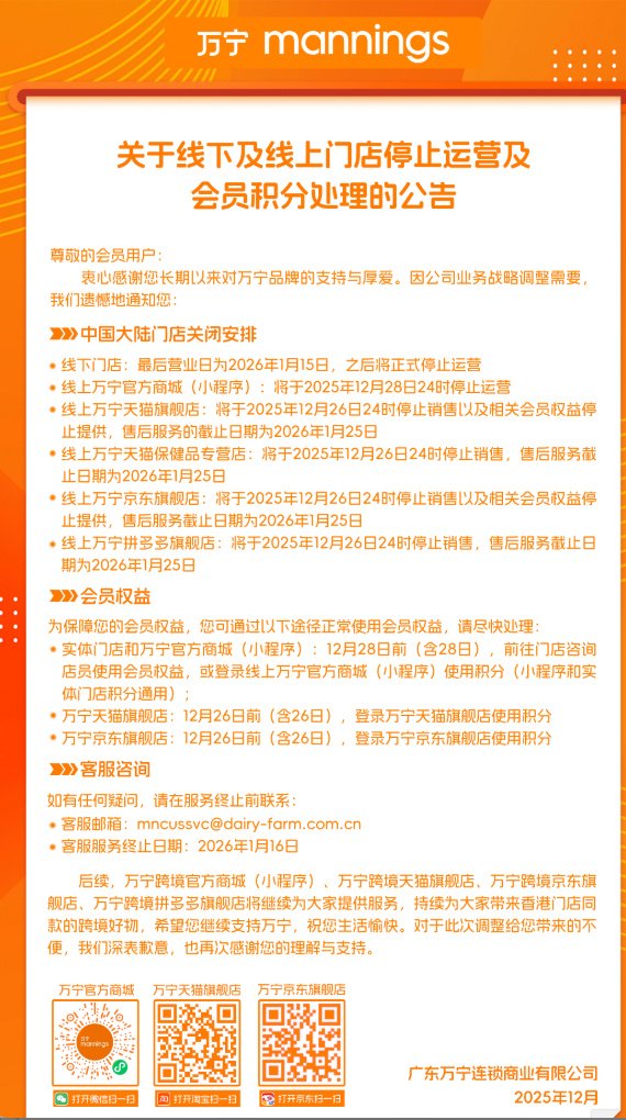 万宁官方商城(小程序)也将于12月28日24时停止营业,而天猫旗舰店、京东旗舰店、天猫保健品专营店则将在12月26日停运。