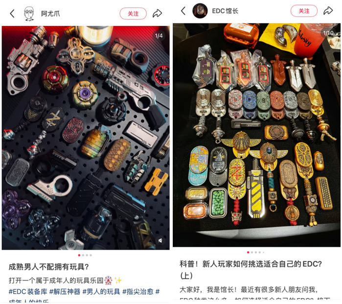 广义来说,每个人都可能是EDC玩具的拥有者。5毛钱一把的美工刀、校门口几块钱一个的塑料陀螺,从兜里随时掏出来秀一把的悠悠球……这些简单物件埋下了“随手解压”的种子,随着一批爱玩的人长大,分流向买卖的供需两端。