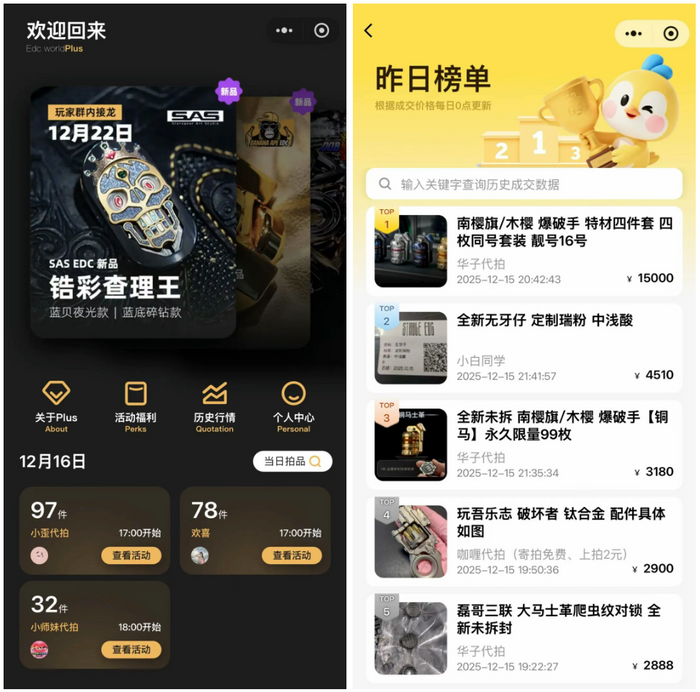“EDC世界plus”和“口袋GuGu”是比较热门的两个拍卖小程序。每天,大约有500-600件玩具通过小程序拍卖流转,拍卖时间集中在下午5点到凌晨12点。拍卖师每上架一件产品,都会获得10-15元的手续费,高于2000元的,还将按一定比例收取佣金。