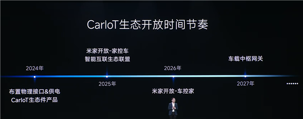 陈君宇进一步公布了CarloT生态开放时间节奏:2024年布置物理接口&供电CarloT生态件产品;2025年米家开放-家控车,智能互联生态联盟;2026年米家开放-车控家;2027年车载中枢网关。