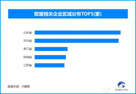 天眼查专业版数据显示,截至目前我国现存在业、存续状态的取暖相关企业超3.4万家。从区域分布来看,山东省、河北省取暖相关企业数量位居前列,两个省市数量总和超过1.1万家,占企业总数的32.44%。