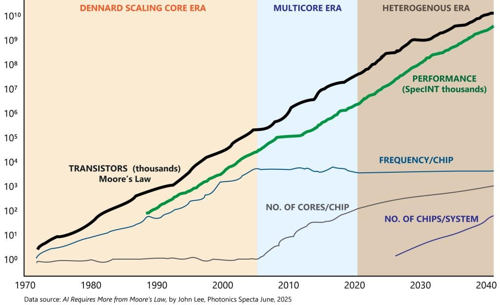 图1.1970年至今微处理器晶体管密度、性能和架构的历史趋势,并预测至2040年。随着晶体管缩放和多核架构优势的减弱,异构计算成为维持摩尔定律的手段。