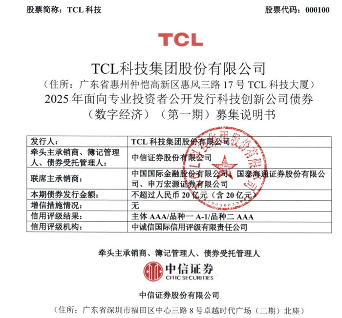 据悉,TCL 科技本次债券发行已获得中国证监会注册批复(证监许可〔2025〕2369 号),注册总额不超过 100 亿元,本次为第一期发行。债券的成功发行将有助于公司优化债务结构,补充中长期运营资金,进一步支撑核心主业持续发展。