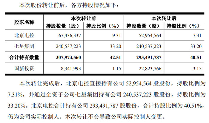 从持股结构变动来看,转让前北京电控直接持股 67,436,337 股(9.31%),与七星集团合计持股 307,973,560 股(42.51%);国新投资此前持有 8,341,993 股(1.15%),受让完成后持股数量增至 22,823,766 股,持股比例提升至 3.15%。公告明确,北京电控与国新投资之间不存在股权、人员等关联关系,亦无其他经济利益关联。